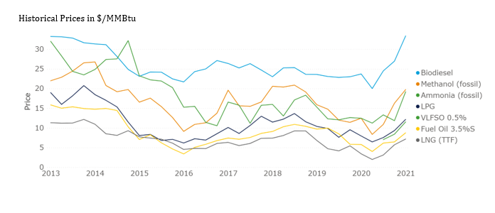 Gas-indexed LNG fuel prices generally follow a rather transparent price escalation, and the following gas-indices serve as the basis: TTFEUR/MWh (Continental Europe); HHUSD/MMBtu (Global, incl. Western Europe); and, JKMUSD/MMBtu (Asia) and NBPGBP/them (UK).
