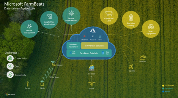 Microsoft Azure FarmBeats is a business-to-business offering available in Azure Marketplace. It enables the aggregation of agriculture data sets across providers. Azure FarmBeats enable users to build artificial intelligence (AI) or machine learning (ML) models based on fused data sets. By using Azure FarmBeats, agriculture businesses can focus on core value-adds instead of the undifferentiated heavy lifting of data engineering.
