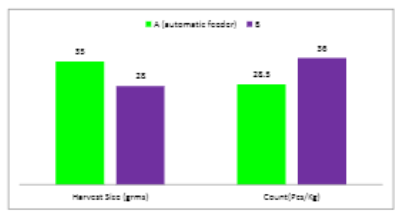 The present report shows that autofeeder pond 1.2 and 1.7 feed conversion ratios by boat feed pond. Yingyuad et al.(2013) studied the 24 hours and 15 hours spreading of feed. But from the present findings, 24 hours feeding shows better results. In the present study, 10 hours shows good conversion ratio. The study conclude that, More efficient feeding management through feeding amount, effective feed distribution, and interval between broadcast adjustments enables a continuous shrimp feeding behaviour. For the prevention of feed waste accumulation at the pond bottom, the feeding management should ensure the lowest FCR and promotes shrimp growth. This latter is directly observed in larger average daily growth rates and shorter production cycles. A more common feeding enables a constant growth of all stocked shrimp, observed with lower broken size at harvest.