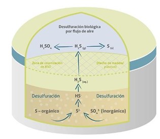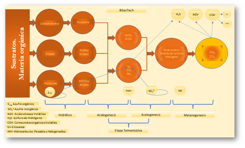 Hydrogen sulfide (H2S) is present in most rotting or biological degradation processes of organic matter when this process is carried out in the absence of oxygen. Under anaerobic conditions, sulfur-reducing bacteria acquire oxygen from sulfate (SO4), converting it into sulfur (S2-), which will give rise to H2S and hence the presence of H2S in the biogas.