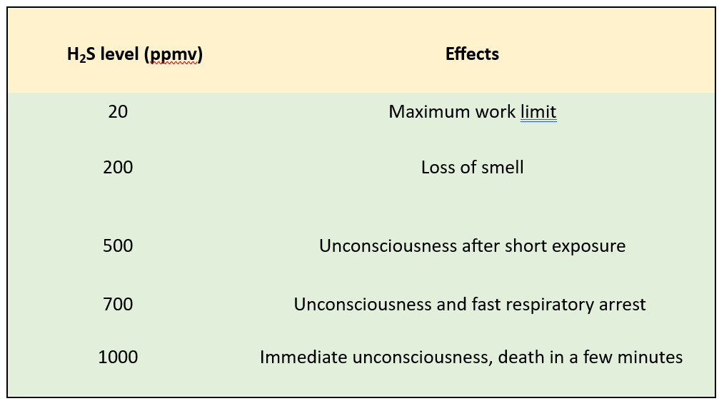 Table Nº 1 shows the effects of the H2S concentration level on the human being who oversees the operation of the biogas facilities or any plant and site.