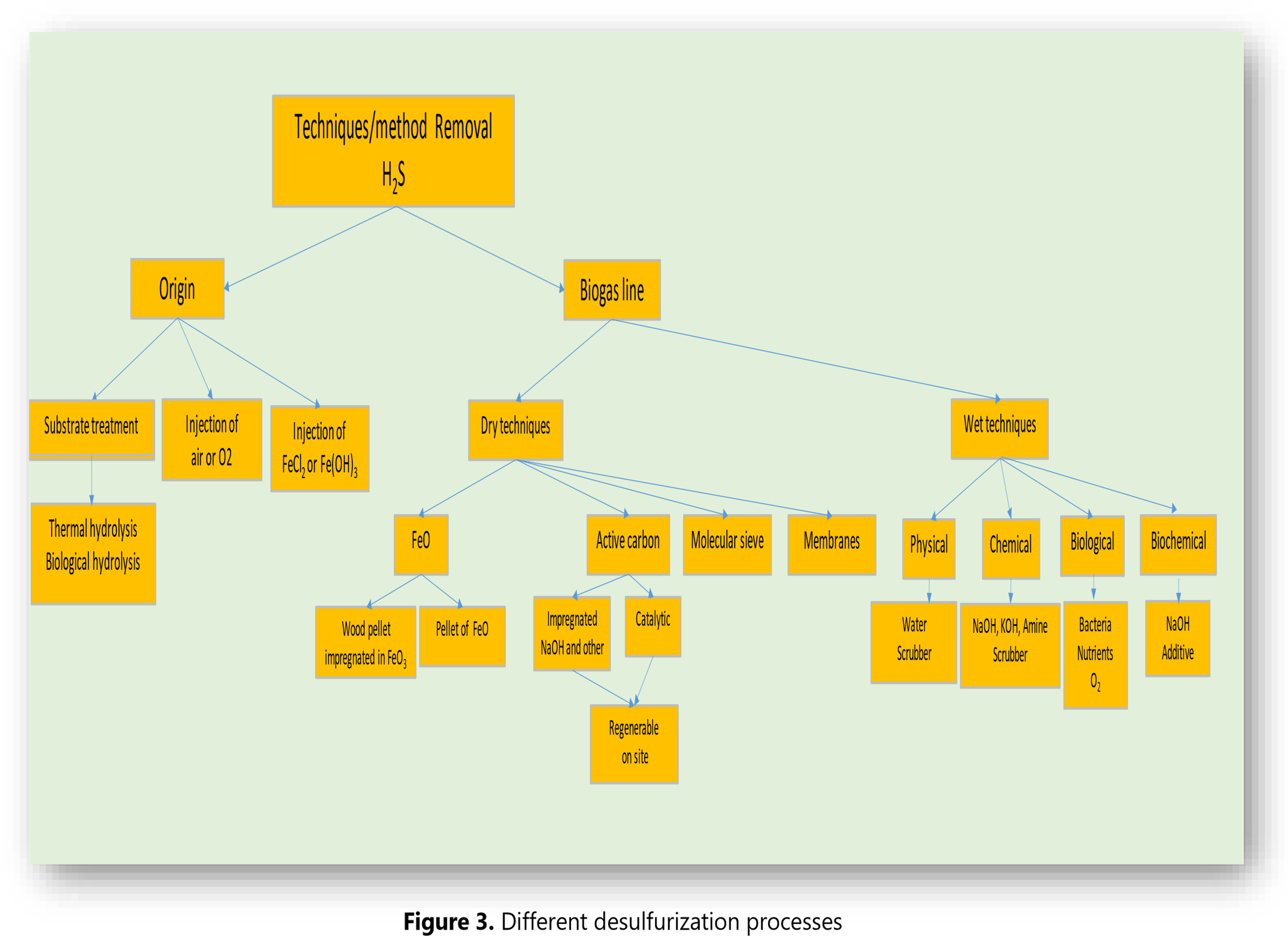 Figure 3 shows the different desulfurization processes applied to biogas cleaning according to the place where they are carried out and the technique/method used.