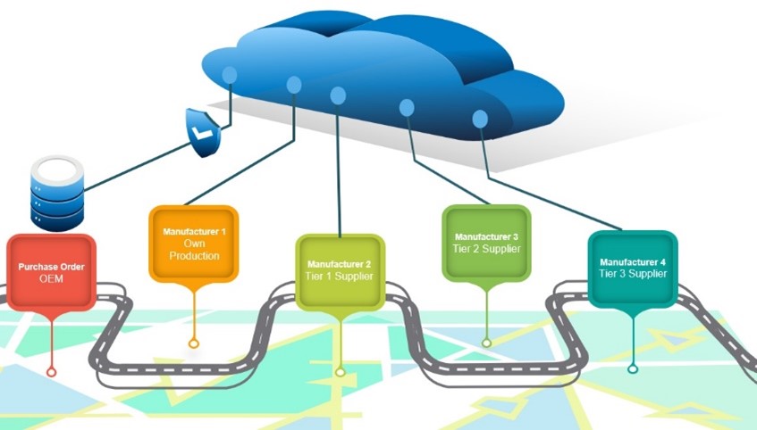 When the OEM sends a Purchase Order (PO) to the platform, it addresses the right Tier 1 manufacturer. In this sense, Tier 1 can subsequently interact in the same way with Tier 2 and Tier 3 suppliers.
