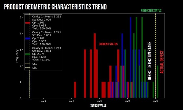 Regression machine learning models help facilitate the prediction of continuous variables like product length, thickness, density, etc based on the current data (red) and output continuous target variable – predicted status (green) as illustrated in the Python matplotlib interface above. Once regression models perform this prediction, classification models can act in tandem to segregate product status as defect/defective or OK parts to ensure quality.