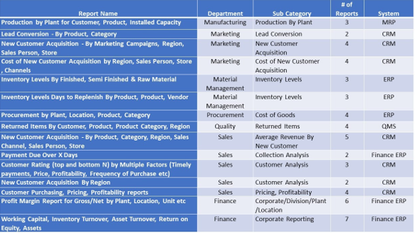 Reports used by the business users for decision making are critical to the business and have a long life – typically for as long as the need remains e.g., consider the following reports used by various departments in a business: