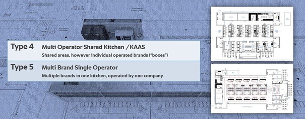 Successful setups Designing an optimized ghost kitchen from scratch to allow highest utilization, fast preparation and most efficient resource consumption will pay out quickly, especially if you want to scale-up and grow your operations. Two models actually turned out best for this task, which would be a "Multi Brand Single Operator Kitchen" (Type 5 ghost kitchen classification) where all space and equipment is shared among all brands for highest utilization or a "Multi Operator Shared Kitchen" (Type 4 ghost kitchen classification) , a typical model popular with KAAS companies to rent out the individual "boxes" to individual brand operators. Both ideally combined with a central kitchen supplying the "Mise-en-Place" to the ghost kitchen satellites offer a perfect scalable solution. This combined with multifunctional, intelligent kitchen equipment will be the most flexibel and sustainable solution.
