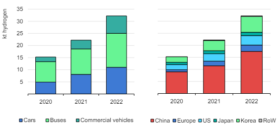 Figure 1. Increase in hydrogen transport consumption, split by vehicle type and country (from IEA Global Hydrogen Review 2023)
