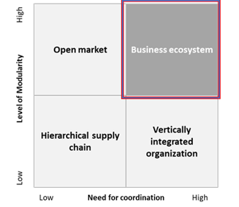 - Business Ecosystem: Finally, there is the scenario where the components display high levels of modularity, and where there is also a need for a high degree of coordination between the parties to make the most out of the business opportunities. This is where business ecosystems come into their own.