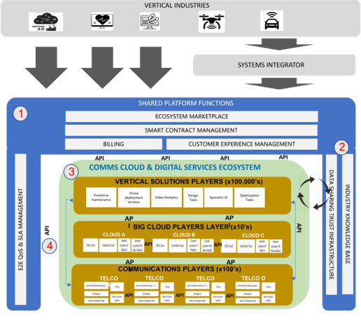 - The communications, cloud and digital services ecosystemthat the platform engages with, will comprise the disruptive technologies that will underpin the transformation of all vertical industries. This will certainly include: 5G public and private network offerings; Easy to use network slicing capabilities; Centralized and edge cloud offerings; Flexible IoT platforms suitable for different industry challenges; as well as tens (if not hundreds) of thousands of niche vertical solution players who have a specific expertise targeted at one or more verticals, and operating in one or more geographical regions. For example, in the case of smart manufacturing these vertical solutions could surround data sharing and optimization of specific manufacturing equipment, or come from a 3rd party AI or digital twin specialists.