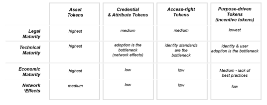 In her book ”The Token Economy”, Shermin Voshmingr defines four generic types of tokens as shown below, along with their current levels of maturity: