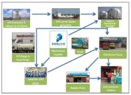 To set up an LPG bottling plant, operators need to create a facility of LPG liquid importing terminal, storage reservoir facility, cylinder bottling facility and a proper distribution network. About the machineries requirement, Bangladeshi LPG operators are entirely dependent on the foreign suppliers (such as Parlym-France, Kosan-Denmark, Renzo-Italy, SMPC-Thailand, Maurya Udyog- India) for related accessories and spare parts. For cylinder manufacturing, the main raw material is Hot-Rolled coil, imported from Thailand, China and Indonesia.