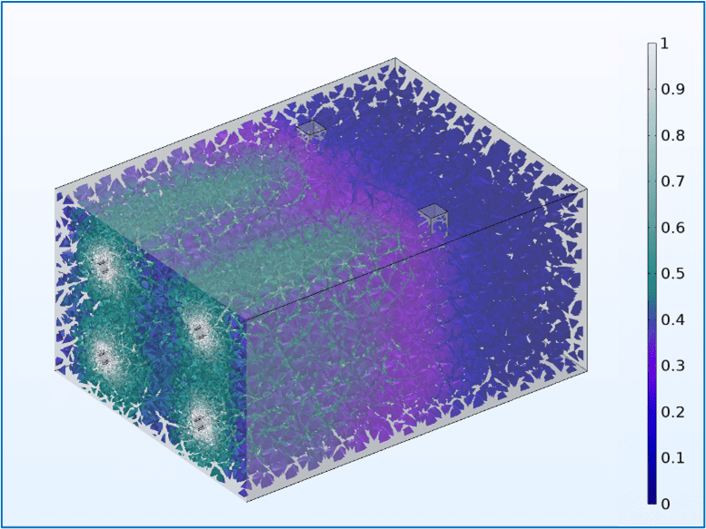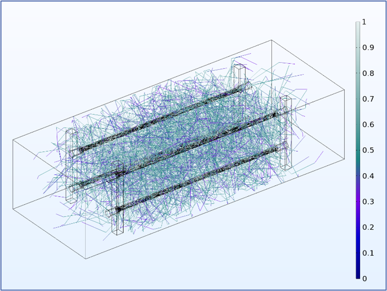 Figure 3. Illustration of ray propagation from the four UV lamps; rays are launched according to a physically realistic model and move through the model, undergoing reflection, refraction, and absorption with each interaction.