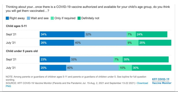About a third of parents whose children are 5 to 11 years old say they want them to get vaccinated against Covid-19 right away (up slightly from July), another third wants to wait and see, and one-quarter gave a hard no in a Kaiser Family Foundation poll conducted just as Pfizer released encouraging trial results in kids. Parents also shared what the pandemic has meant for their kids ages 5 to 17 attending school in person: