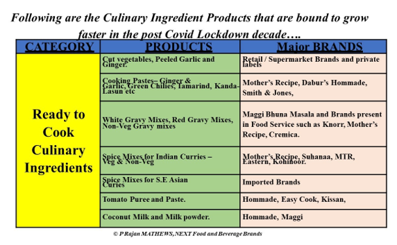 The rise of value-added Culinary Ingredients for Home Cooking: During this Extended Pandemic Lockdown when all were to stay at home, one of the major essentials is the Daily Food to be made with no Domestic help or Cooks coming and also with prepared food cannot be ordered from the nearby hotels/restaurants and eateries. The consequence of this being that the house-lady gets to do more with demanding children and all at home with no domestic help. In the near future, the migrant workers who have left for their native will not be coming back immediately and most Domestic help and cooks belong to the families of these migrant workers and hence there will be a shortage of regular cooking and domestic helps. Hence Housewives will be using more of the products which will remove the drudgery of peeling, cutting, grating, grinding, and sautéing of vegetables and culinary ingredients. The demand for Cut Vegetables and peeled garlic and ginger available at major Retail supermarkets will be in great demand. The basic culinary pastes such as Ginger Garlic pastes, Tamarind pastes, Coconut milk and milk powders, Tomato Puree, and pastes, Kandha Lasun mixes will grow at exponential rates due to high demand.