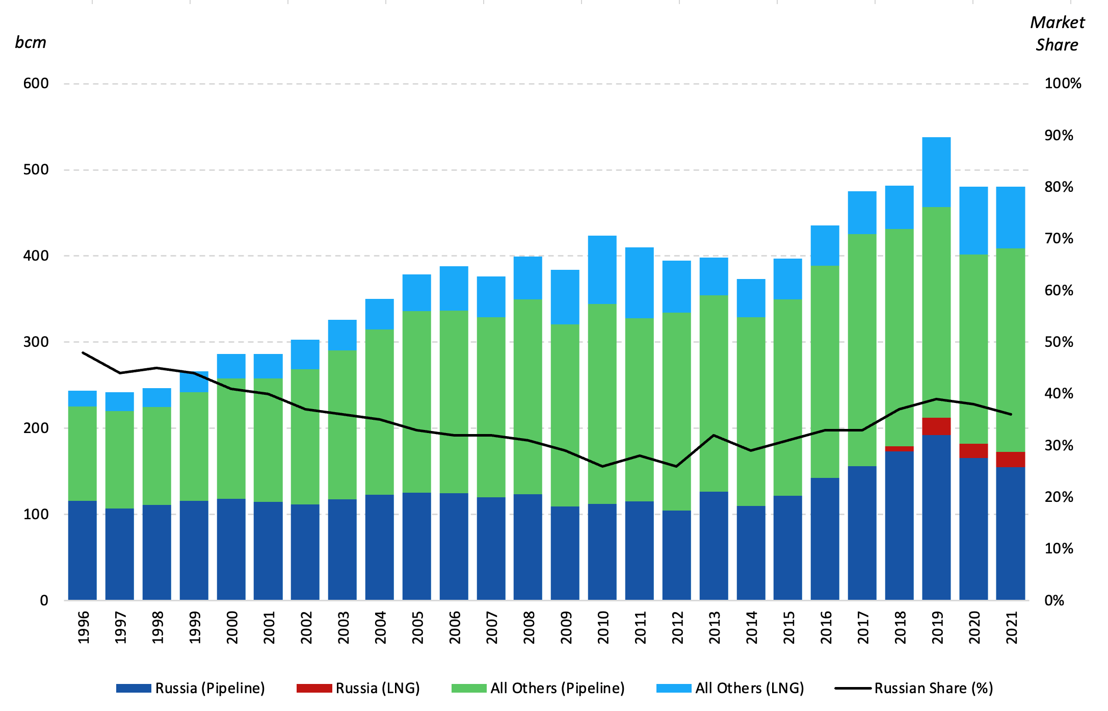 New Liquified Natural Gas (LNG) imports and additional pipeline supplies from other producing regions are not enough to make up for the almost 40% Russian market share in Germany and Italy — similar to the percentage in the EU as a whole.