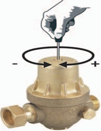 - To reduce the pressure, undo the adjusting screw (anticlockwise as you look at the screw from above), slightly open a tap for a moment, close again, and then tighten the screw again until you obtain the desired pressure.