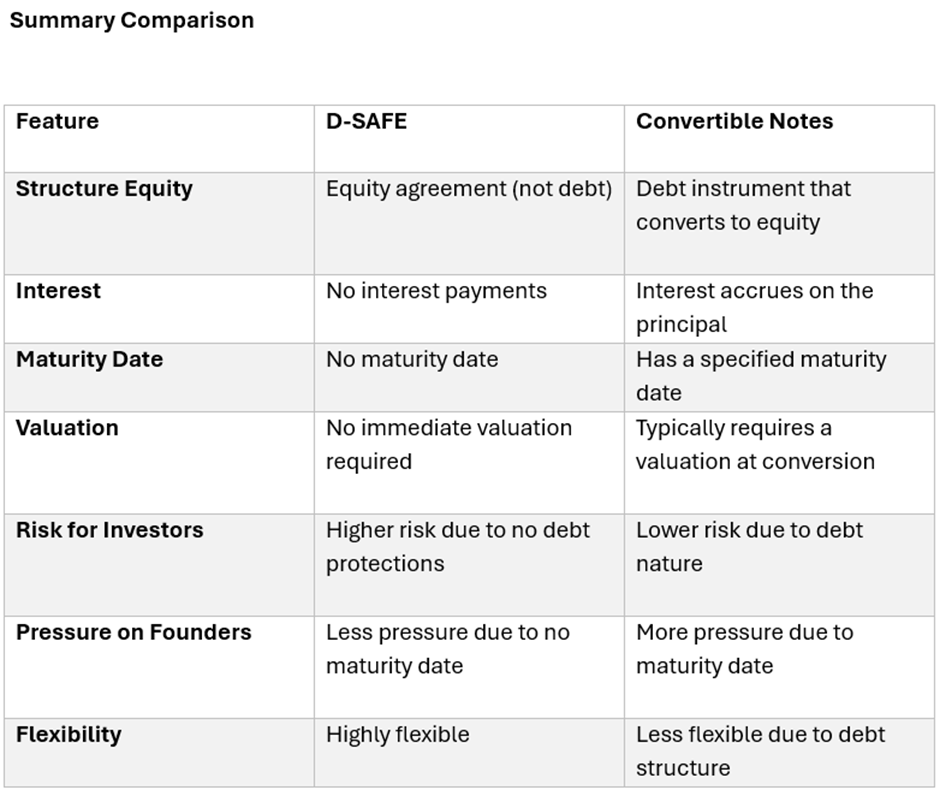 Simplicity: D-SAFE agreements are generally simpler and more straightforward than convertible notes, with fewer legal complexities, making them easier to negotiate.