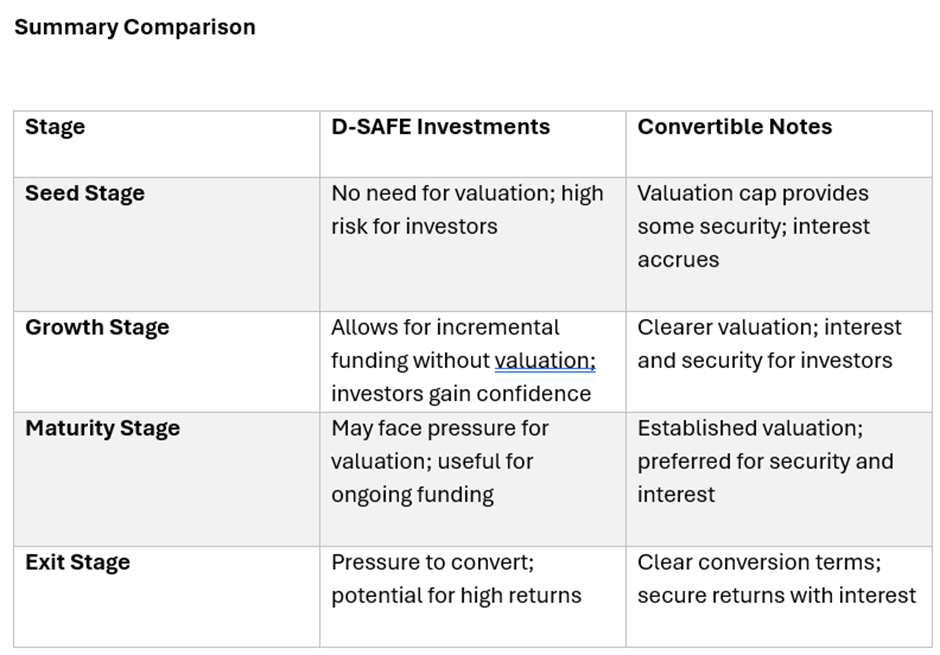 Conversion Benefits: Like D-SAFE, convertible notes often include discounts and valuation caps, giving investors a favorable position in the next financing round.