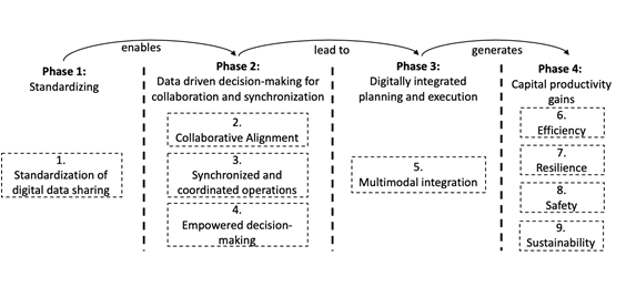 Standardized data sharing is a precondition for collaborative alignment as standardization allows the achievement of a common situational awareness among parties who need to coordinate their actions to transact a service. For example, a ship berthing might require collaborative alignment among a ship’s captain, tug masters and linesmen. Such operations are often subject to continual re-planning due to disruptions, such as a ship’s delayed departure from the immediate prior port or an unexpected change of weather.